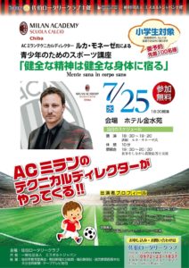 ACミランのテクニカルディレクターであるルカ・モネーゼ氏による青少年のためのスポーツ講座「健全な精神は健全な身体に宿る」を開催いたします。